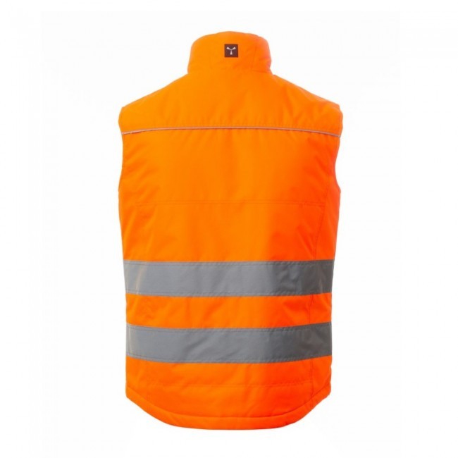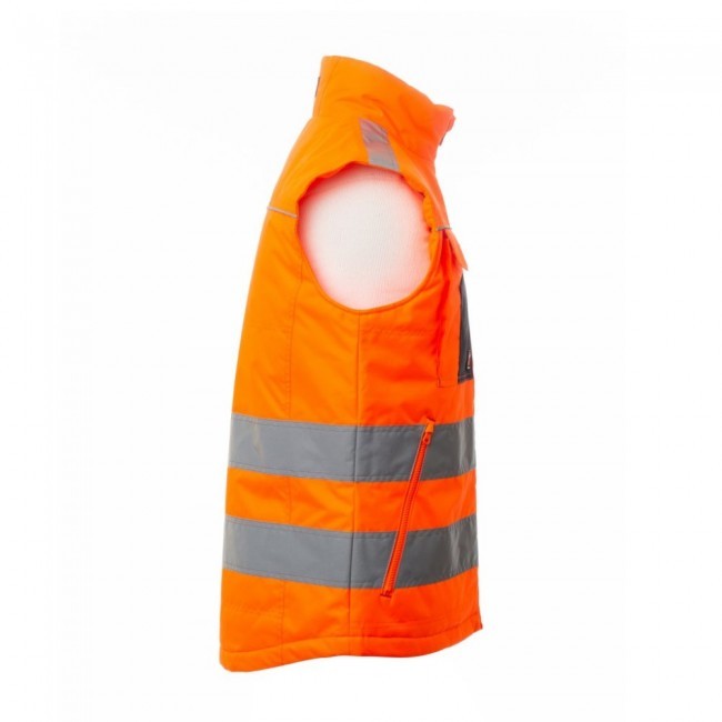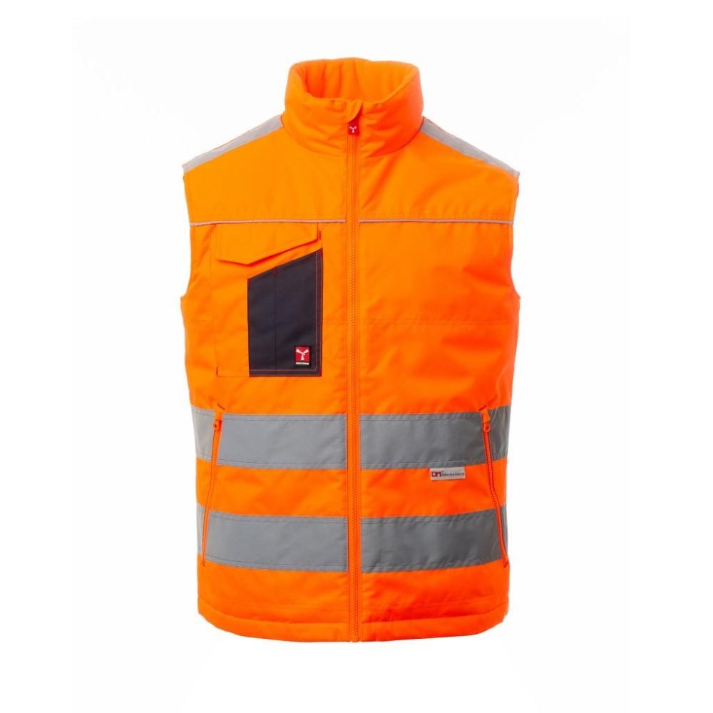 Ανακλαστικό γιλέκο υψηλής ορατότητας unisex, με ανακλαστικές λωρίδες στους ώμους και το σώμα. Κλείσιμο με μεταλλικό φερμουάρ “semi-auto lock” και προσαρμοσμένο τράβηγμα. Μία πολυχρηστική διχρωμία θήκη στο στήθος με δαχτυλίδι για καρτελάκι και κλείσιμο με καπάκι LOCK SYSTEM. Δύο εξωτερικές τσέπες με φερμουάρ. Εσωτερικός γιακάς από πολικό φλις. Μία εσωτερική τσέπη με βέλκρο.