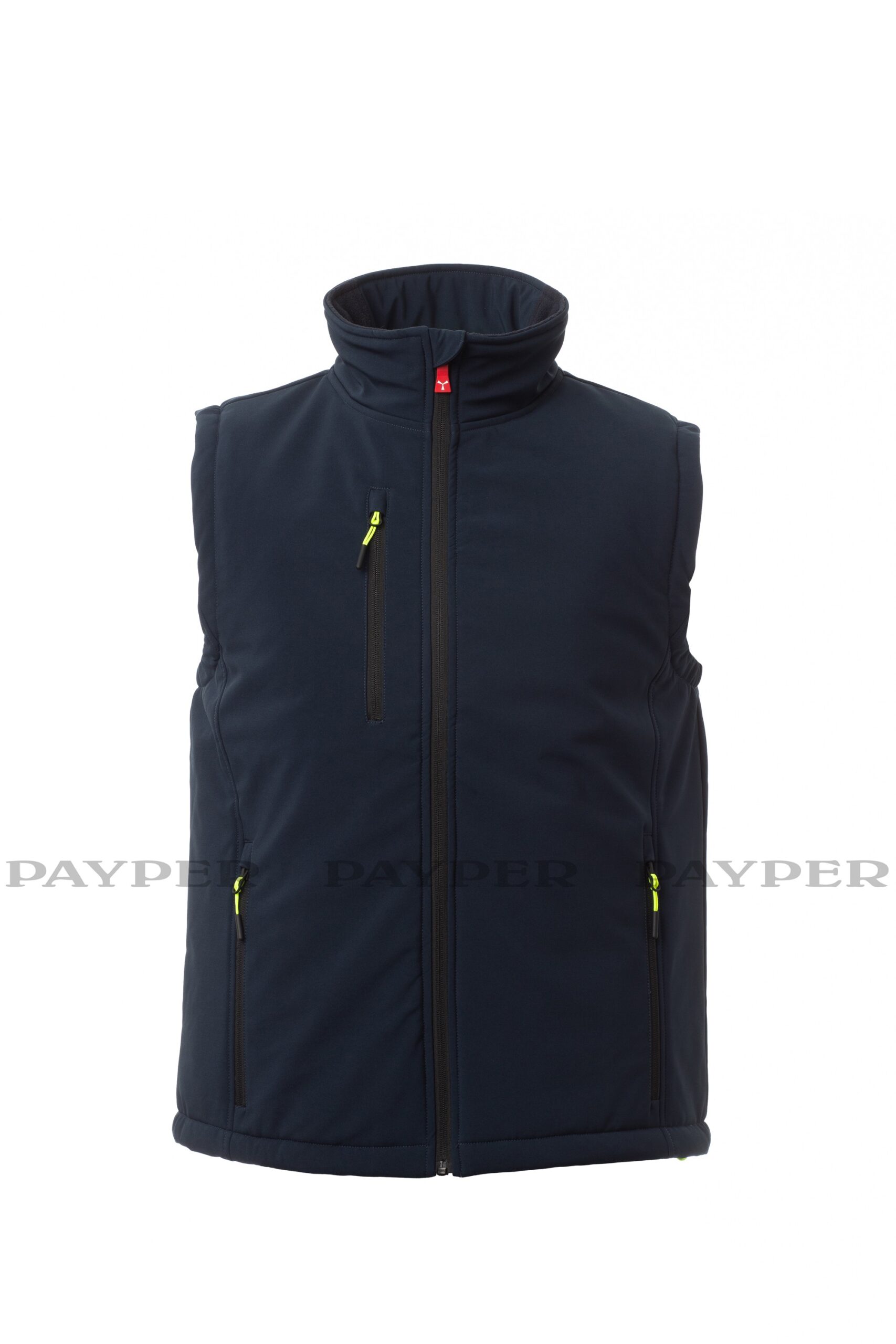 Γιλέκο soft-shell με εσωτερική επένδυση, κλείσιμο με φερμουάρ με μεταλλικό δρομέα “semi-autolock” και εξατομικευμένο οδηγό. Δυο πλευρικές τσέπες και μια τσέπη στο στήθος που κλείνουν με φερμουάρ. Φθορίζοντες οδηγοί. Δύο εσωτερικές τσέπες, μία εφαρμοστή με φερμουάρ και μία θήκη tablet που κλείνει με velcro. Ρυθμιζόμενο κάτω μέρος με εξατομικευμένα stopper.