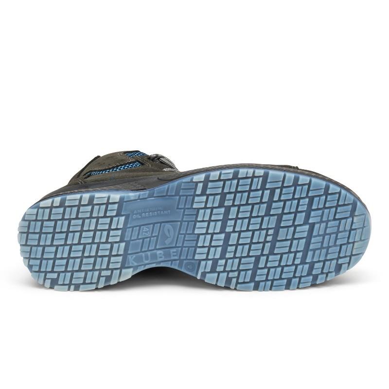 Σόλα της σειράς Kube: Αντιστατική πολυουρεθάνη διπλής πυκνότητας (PU/PU), ανθεκτική στην υδρόλυση κατά ISO 5423: 92, στους υδρογονάνθρακες και στην τριβή. Ανθεκτική στους κραδασμούς και αντιολισθητική – anti-shock + anti-slipping SRC. Με ειδικό σημείο κάμψης στο μπροστά τμήμα και με κλίση στην φτέρνα που βελτιώνει το περπάτημα.